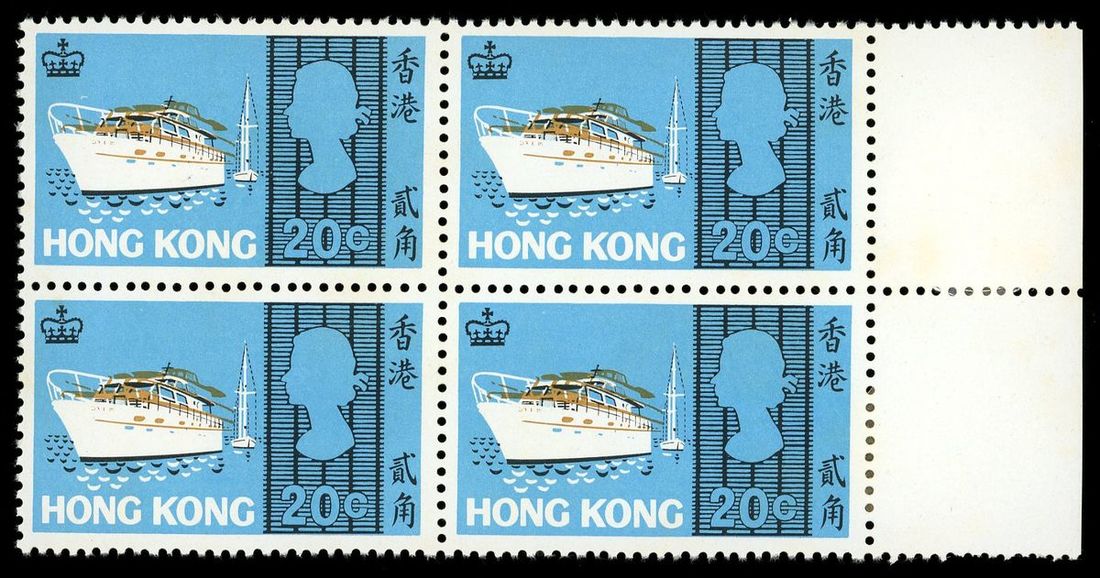 1968 (24 April) Sea Craft 20c block of 4 with BROWN colour shift Upward variety, toning, unmounted mint.