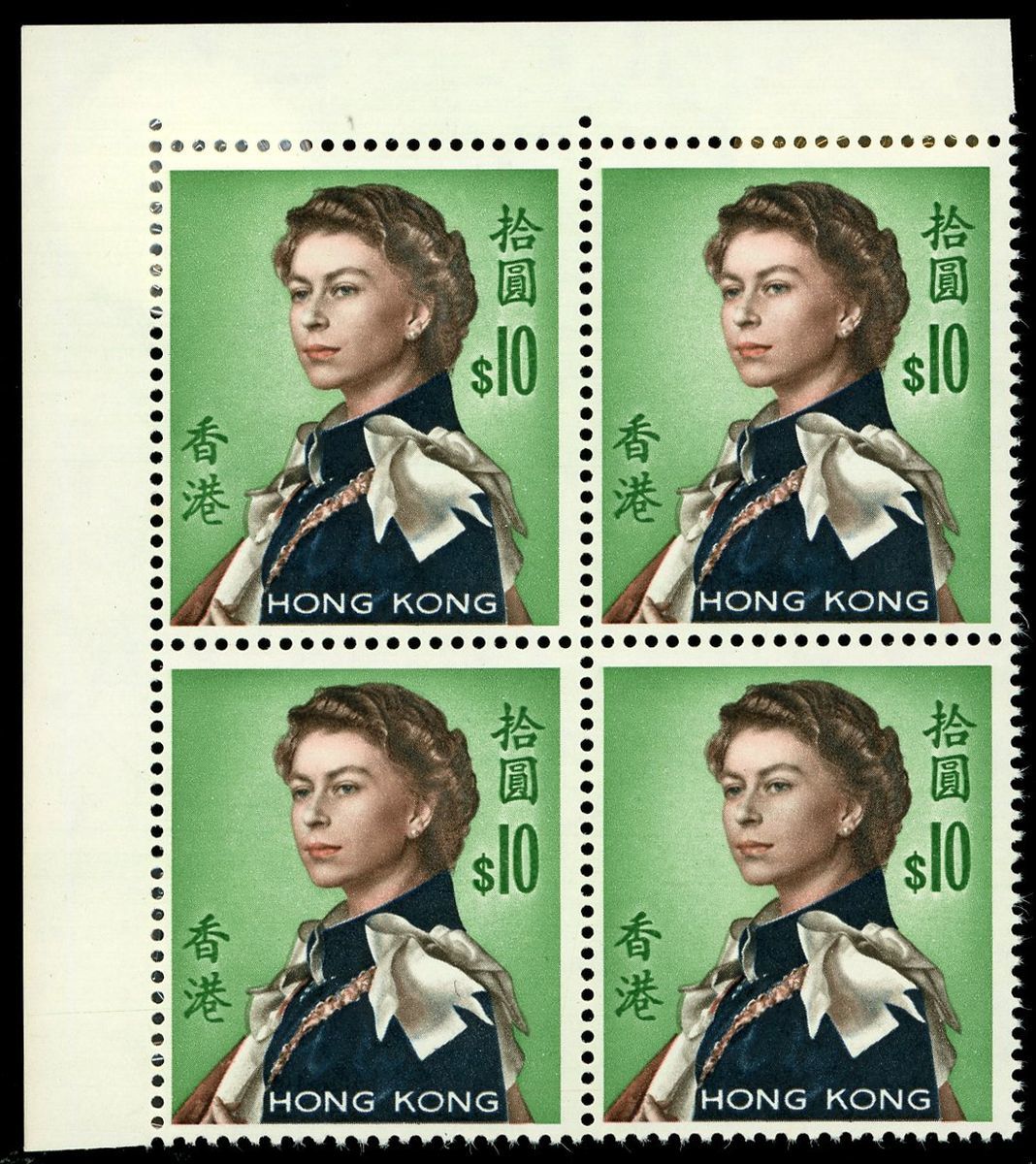 1970 QEII Annigoni Portrait $10 Left Top corner blockk of 4, with Pale Yellow Colour omitted variety, fine unmounted mint.