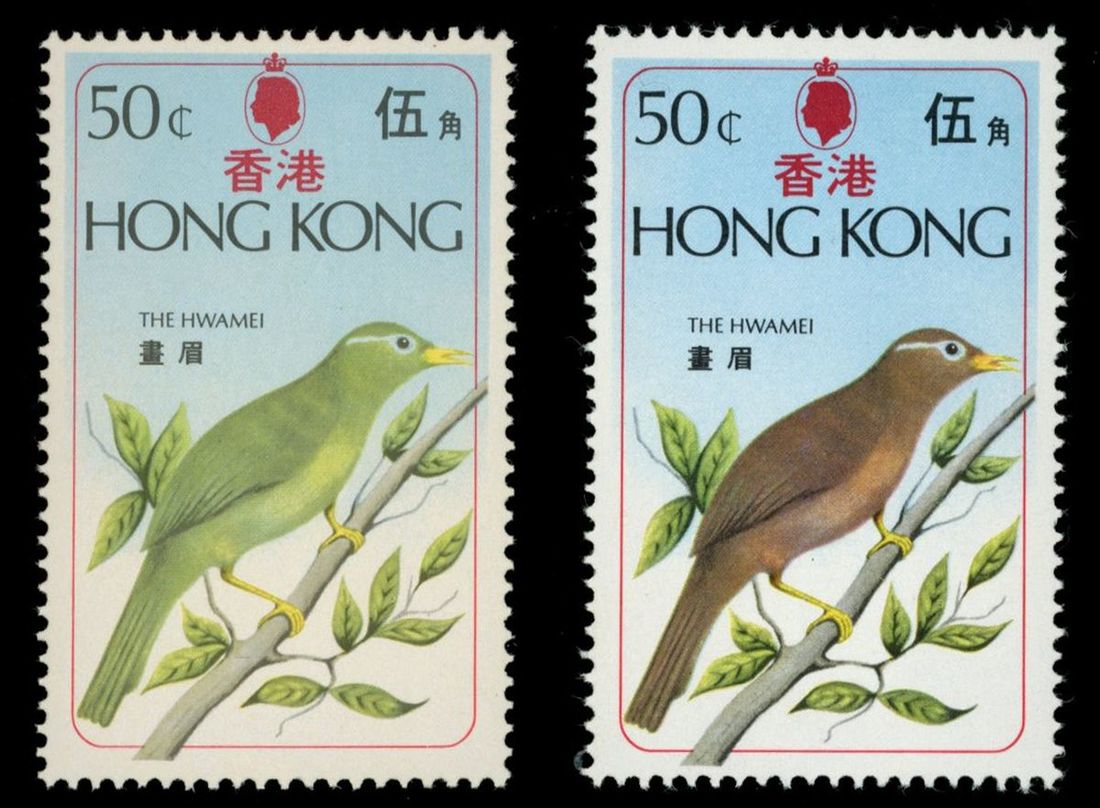 1975 (29 Oct.) Hong Kong Birds 50c. The Hwamei, brown colour missing variety, another one for comparison, unmounted mint, lightly toning.