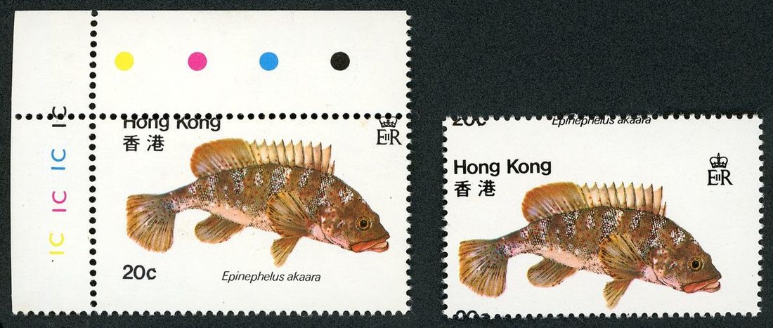 1981 (28 Jan.) Hong Kong Fishes 20c x 2, with shift perforation variety, fine unmounted mint (2).