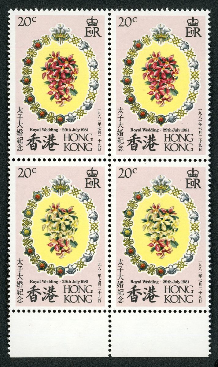 1981 The Royal Wedding 20c, marginal block of 4, some area missing RED color variety, fine unmounted mint.