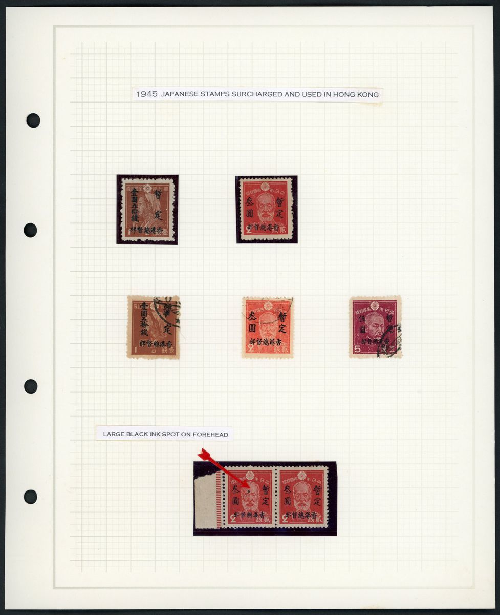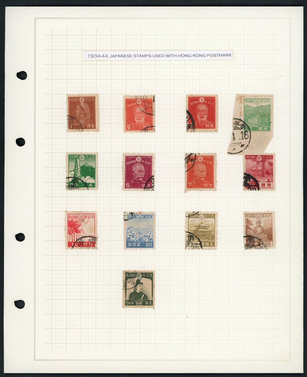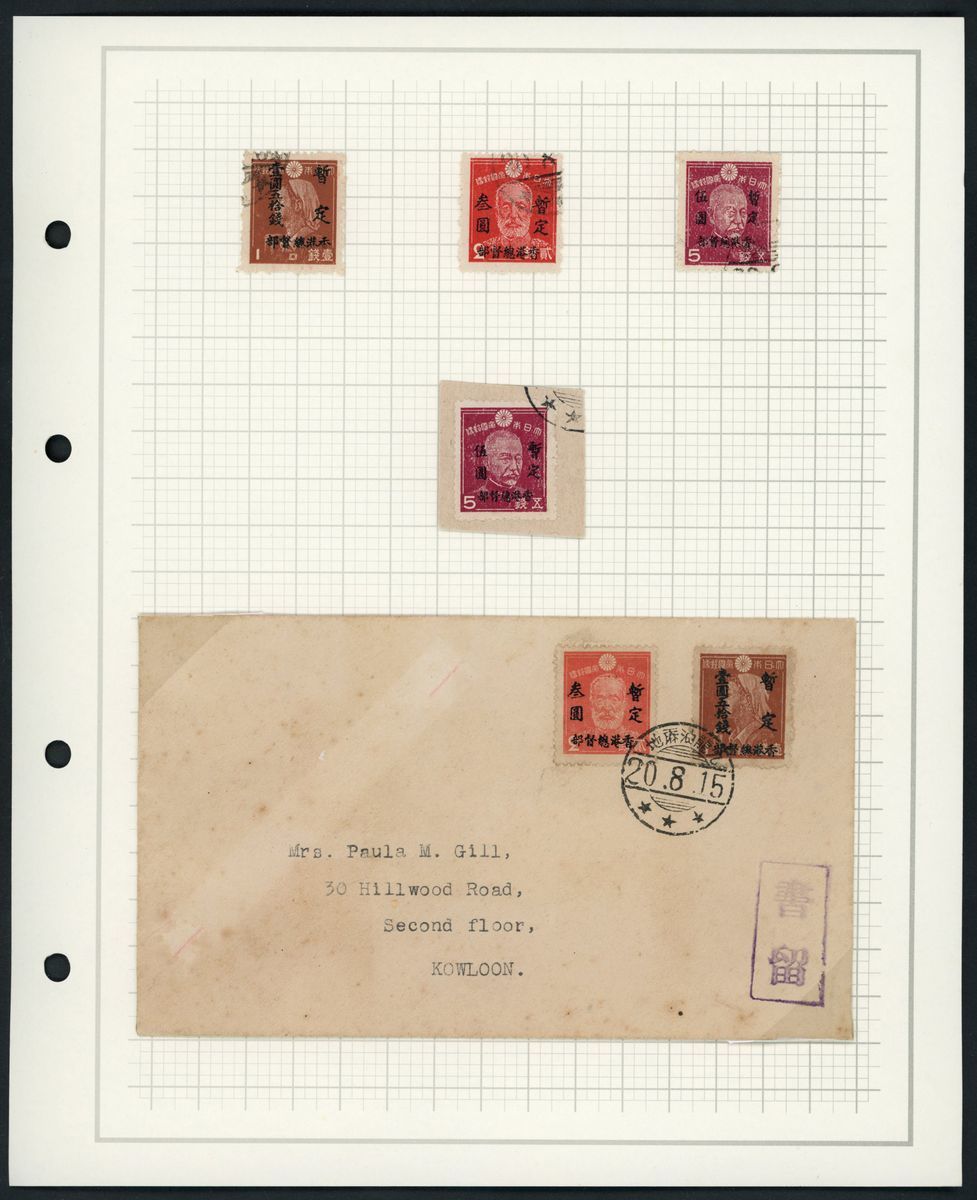 1943-45 selection of used on three album pages including 1s. to 5y. with Hong Kong postmark, 5y. on 5s. (3) used, and cover to Kowloon tied by Yau Ma Tei c.d.s., fine.