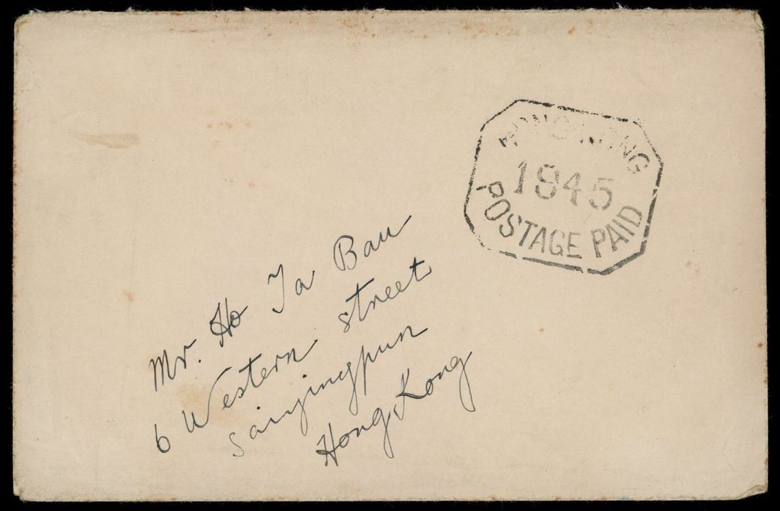 1945 local envelope bearing a mostly very fine octagonal "HONG KONG/1945/POSTAGE PAID" handstamp, used only for three weeks post-liberation, scarce.