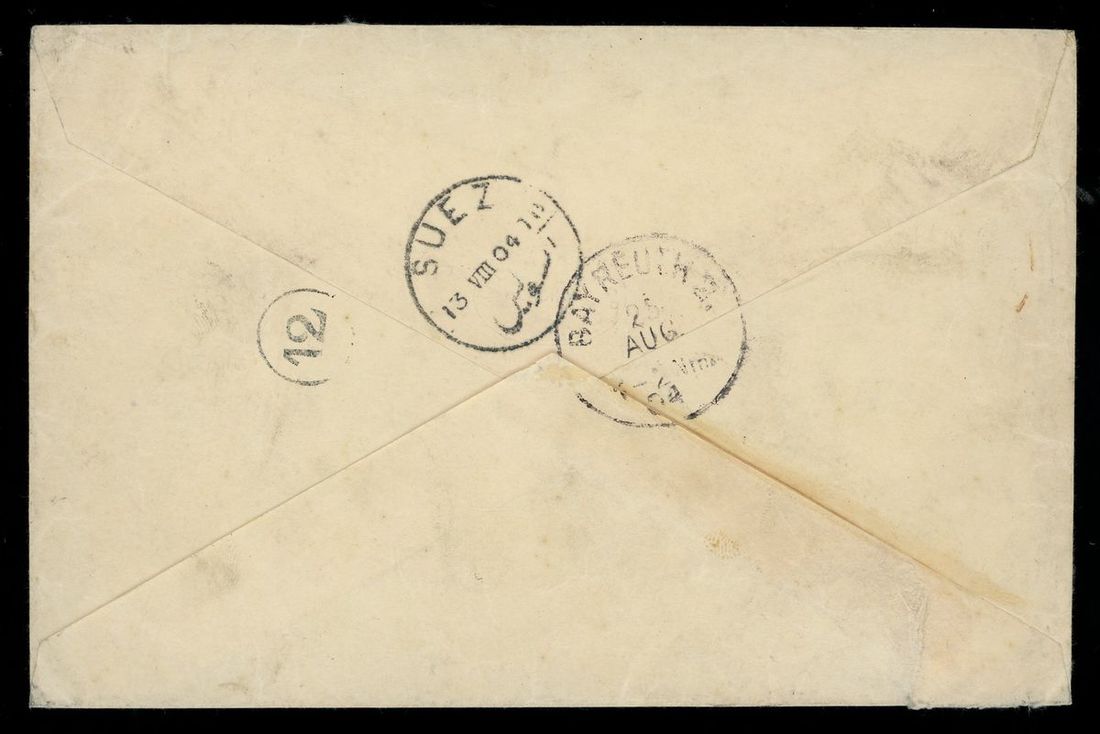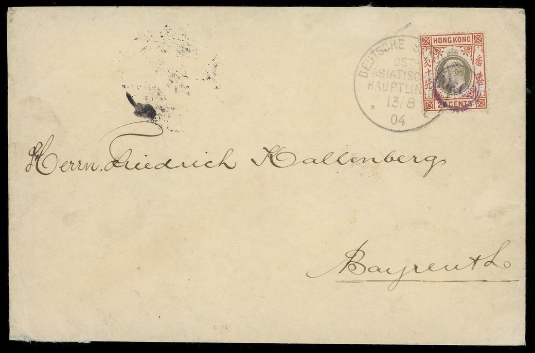 1904 (13 Aug.) Hong Kong to Germany, bearing KE VII 20c stamps, cancellec by German Paquebot c.d.s. On reverse with SUEZ transit and Germany arrival c.d.s.