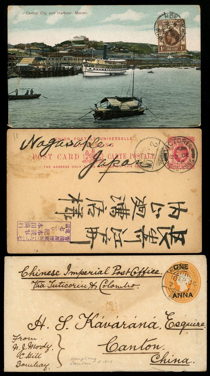 1908 - 1914 A group of 3 cover & postcards to Japan, U.S.A., & to Canton from Colombo, please review (3).