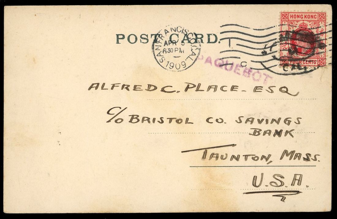 1909 (4 March) A picture postcard to U.S.A., bearing a KEII 4c stamp, showing a Purple "PAQUEBOT" handstamp and San Francisco Apr 5 1909 arrival chop.