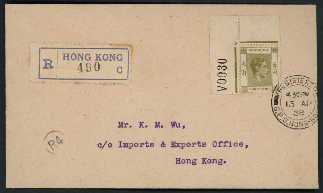 1938 (13 Apr.) registered first day cover to Local bearing KGVI 30c. olive green with top left corner sheet No. V0030 tied by "Registered G.P.O. Hong Kong" c.d.s., showing registered label alongside, very rare.