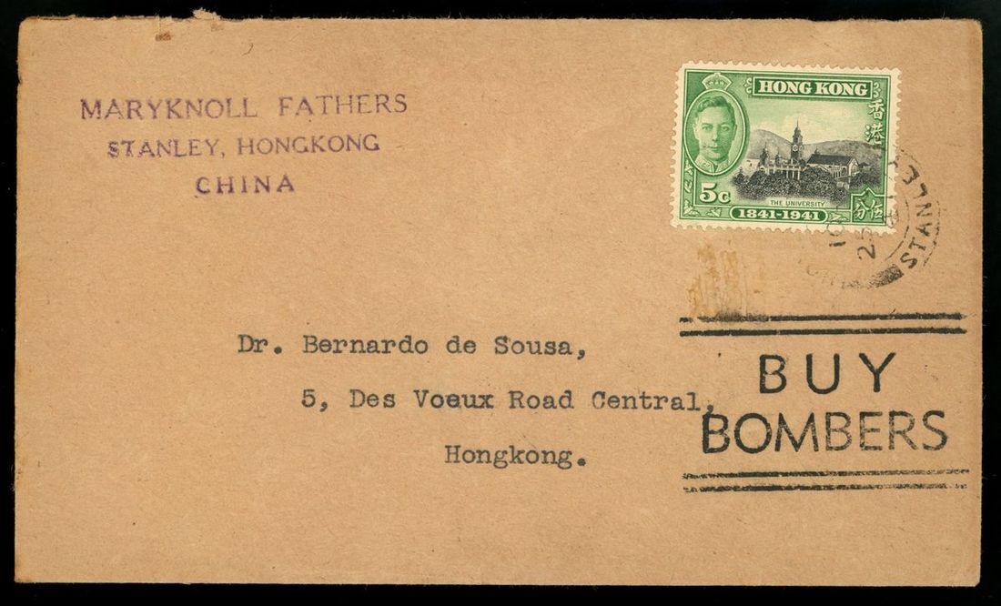 1941 (25 Oct.) envelope to local bearing 1941 Centenary 5c. tied by "Hong Kong/Stanley" c.d.s., showing good strike of "Buy Bombers" handstamp , fine.