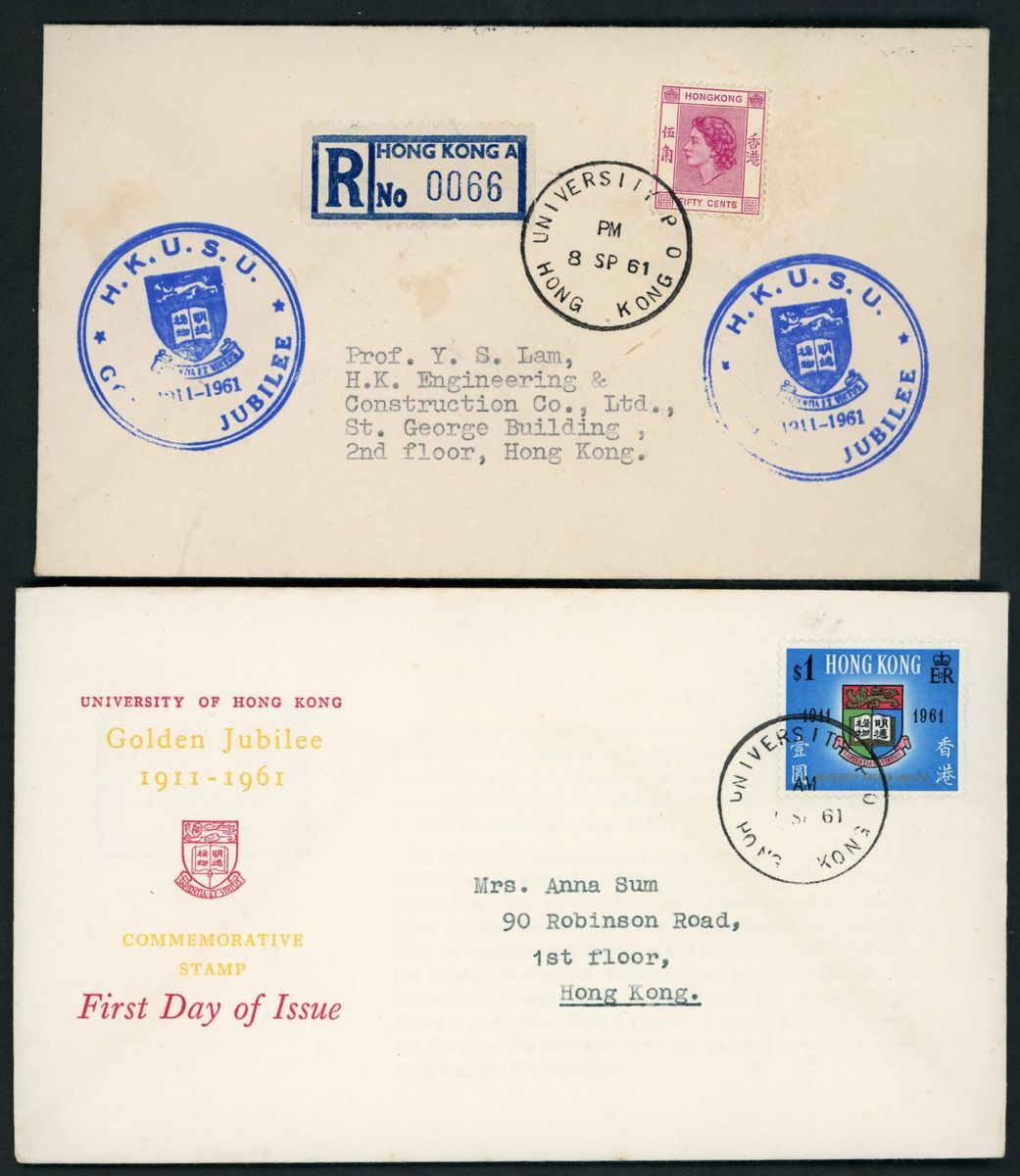 1961 (8 Sep.) registered envelope to local bearing QE 50c. tied by first day of Temporary post office in H.K.U. showing two good strikes of Students' Union commemorative chop, plus first day cover with T.P.O. c.d.s., fine.