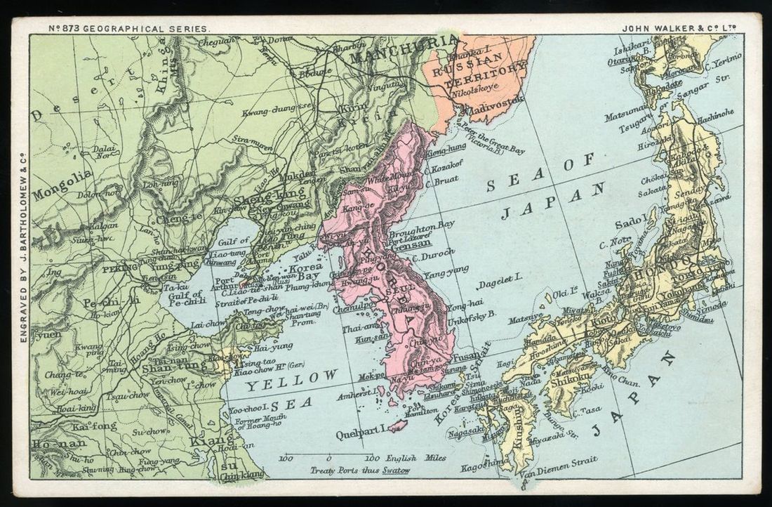 1910s John Walker Geographical Series No. 873 North East China, Korea, Japan, map postcard, unused, fine.