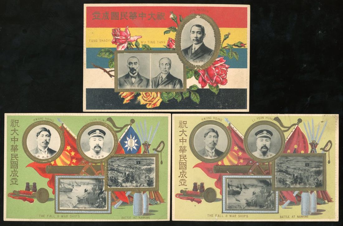 1912年東京尚美堂印製大中華民國成立紀念彩色圖畫明信片一組6枚不同,上分別印有孫中山,袁世凱,唐紹儀,吳廷芳,黃興,黎元洪等人物肖像,以及辛亥革命戰爭場面,均為使用,整體保存完好,非常少見