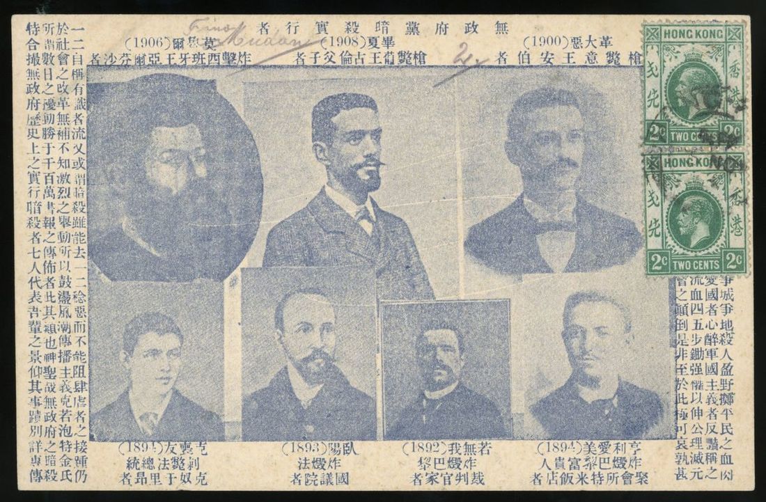 1915年香港寄澳門明信片1件,貼香港國王像2先2枚,銷香港日戳,片為廣州晦鳴學社發行,無政府主義宣傳片,片背印各國無政府黨暗殺實行者照片,並有文字注解,保存完好,少見