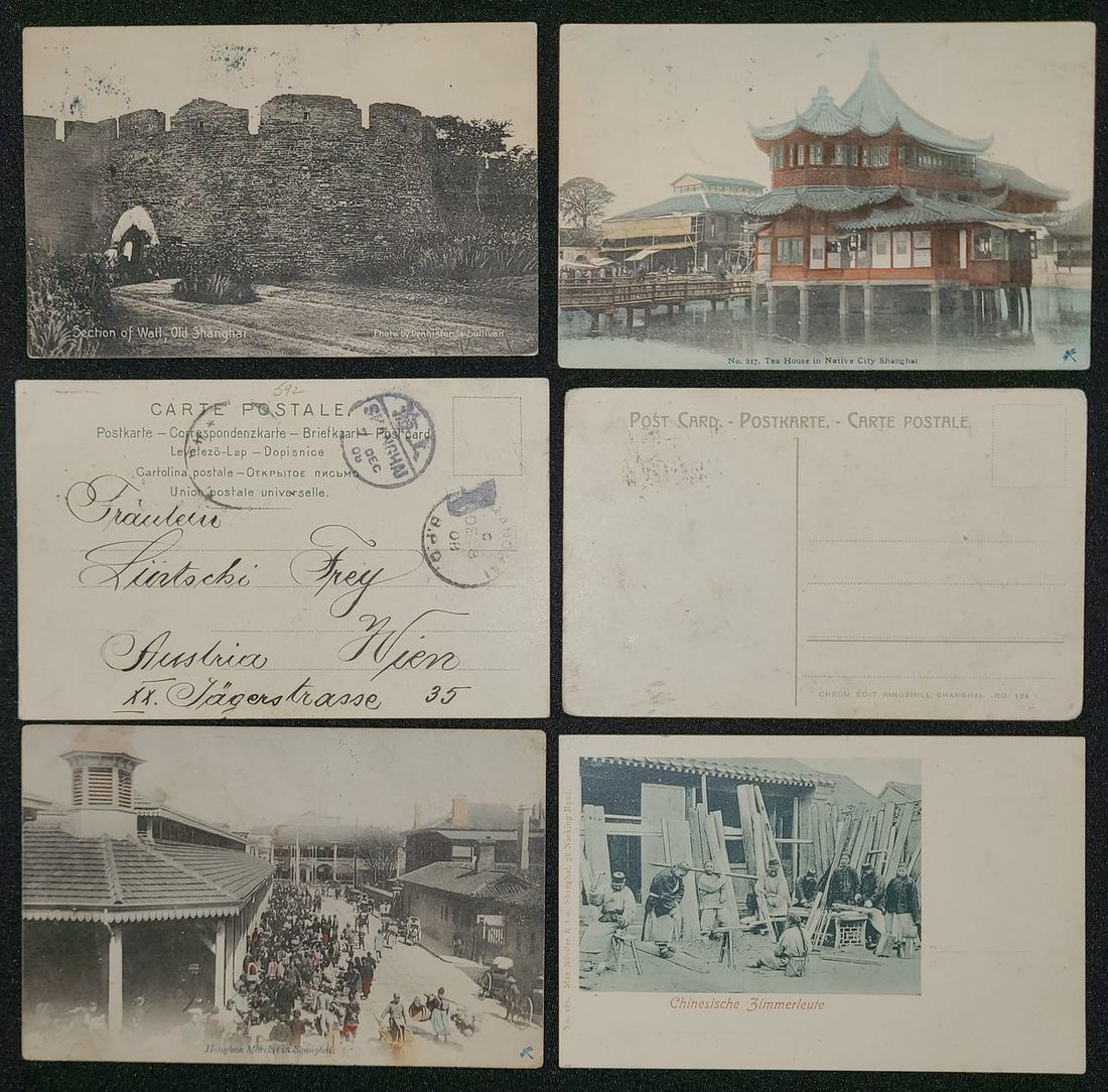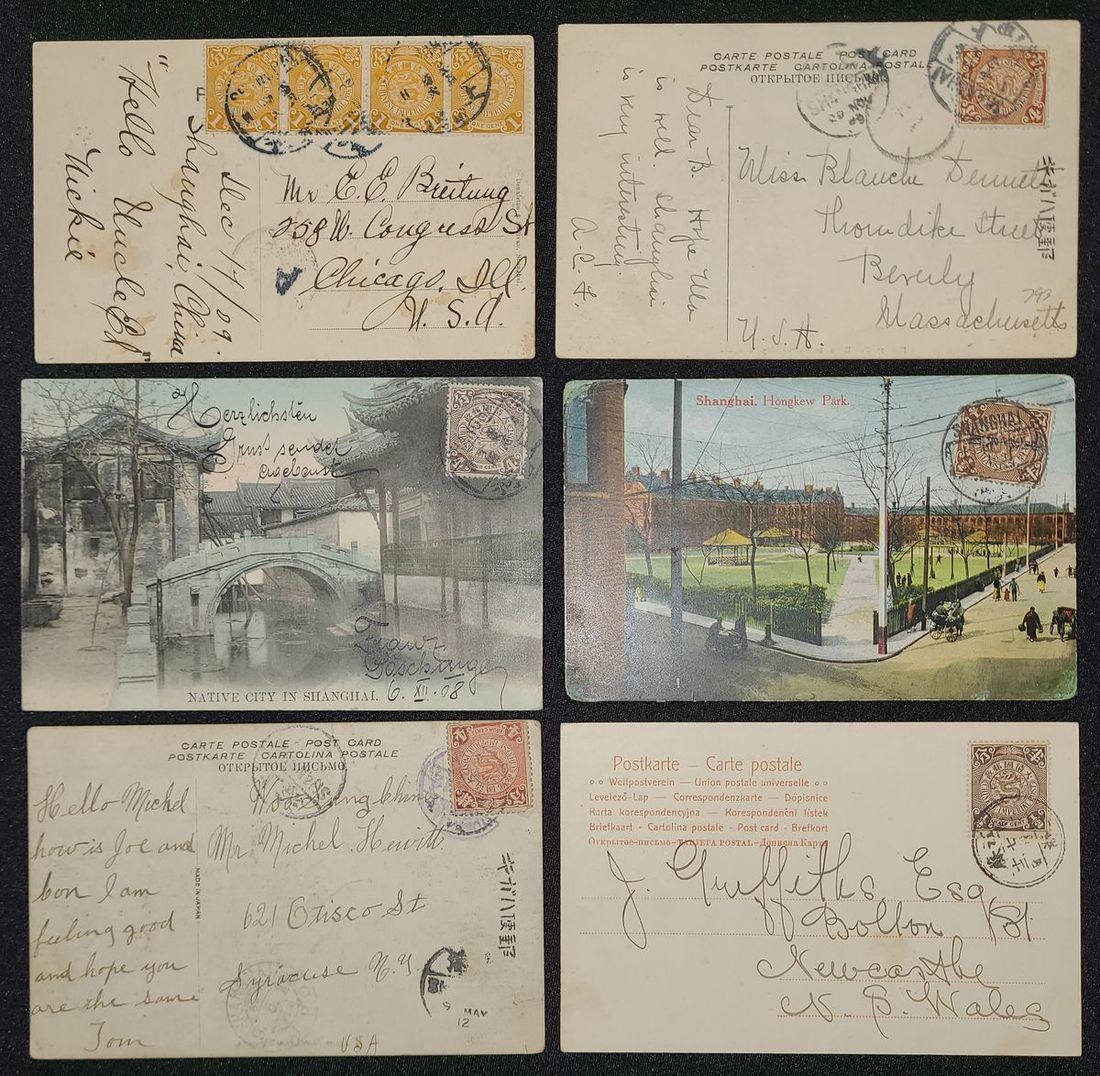 清代上海題材圖畫明信片6件,均貼倫敦版蟠龍郵票,其中4件實寄海外,銷上海郵戳,內容包括上海外城牆,上海豫園,虹口公園,虹口市場街景,中國木匠等,整體保存完好,請預覽