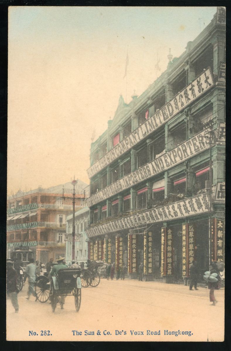 1910s-1920s street view of Des Voeux Road Central in Central, Hong Kong Island, with Dah Sing Company on the right. Colored postcard.