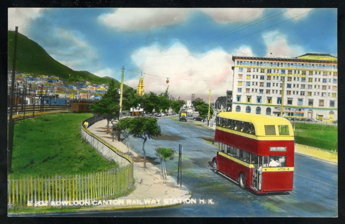 1950s handcolour RPPC of Salisbury Road, Tsim Sha Tsui, Kowloon, you can see a bus and the Peninsula Hotel not far away.