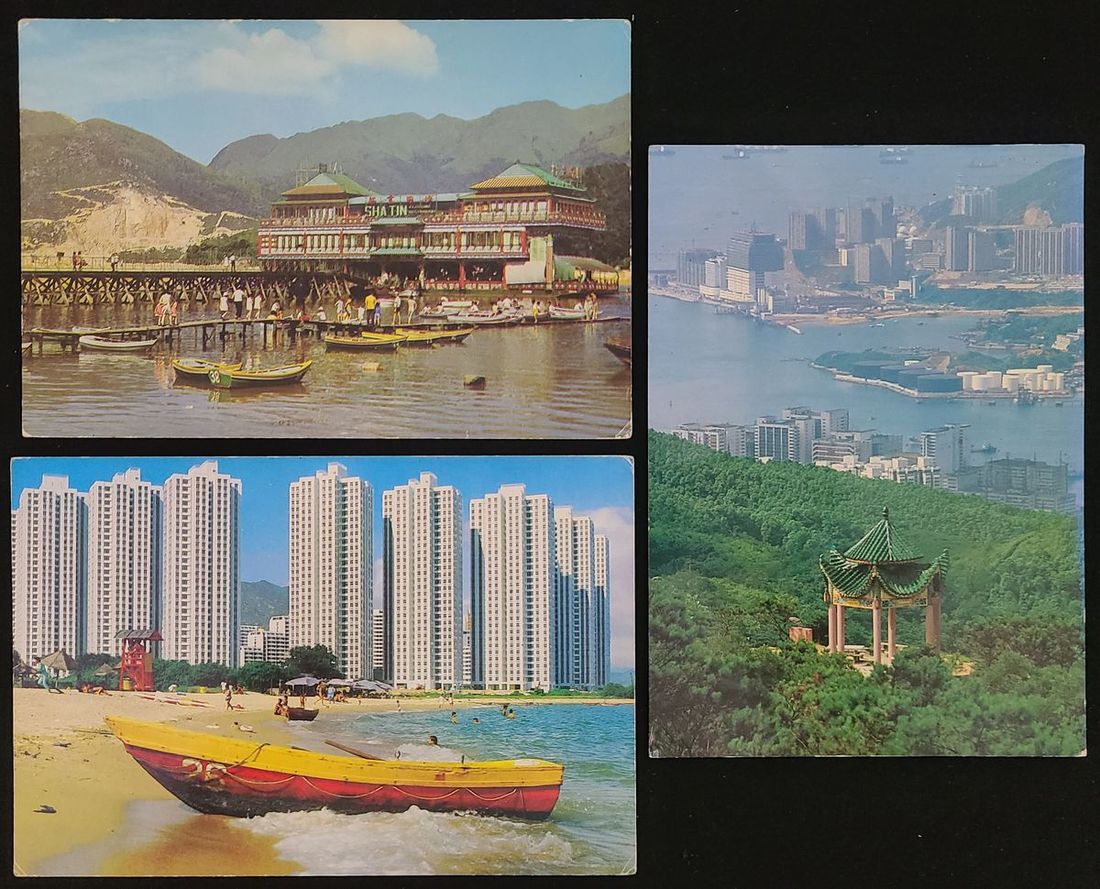1960-1980s three postcards for the New Territories of Hong Kong; they are: Sha Tin Floating Restaurant, Tsuen Wan from Tai Mo Shan and new Housing Estate, Butterfly Bay, Tuen Mun.