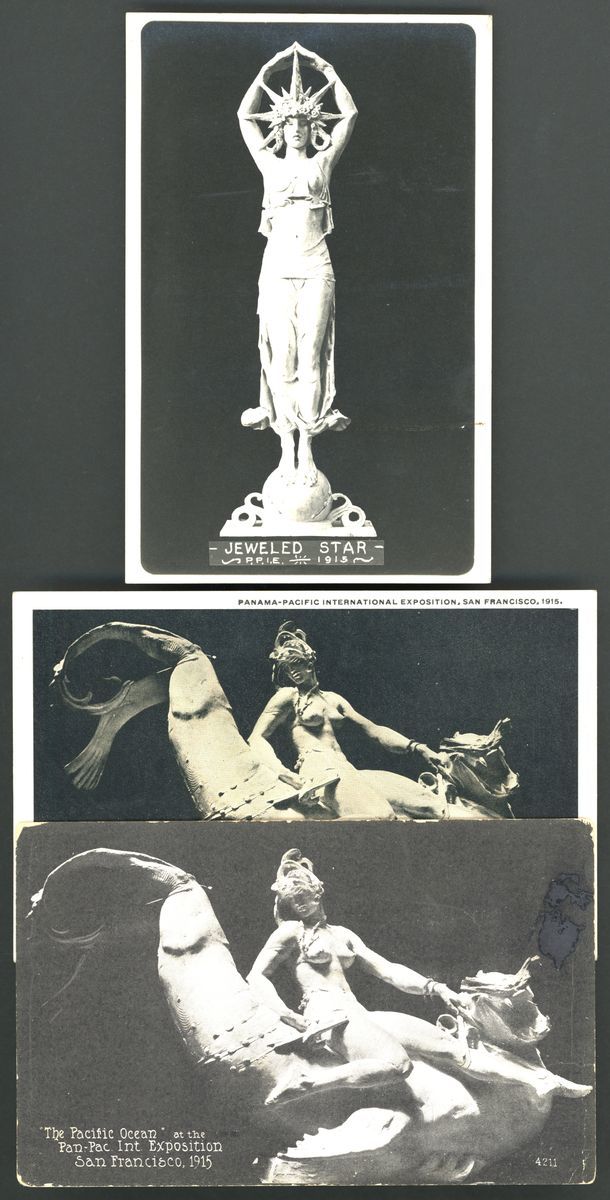 1915 three postcards from the Panama-Pacific Exposition in San Francisco, USA. One of them is an official commemorative postcard.