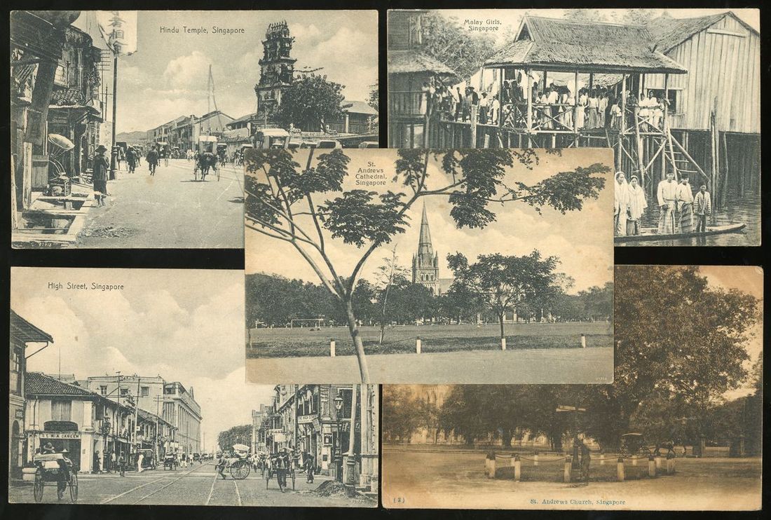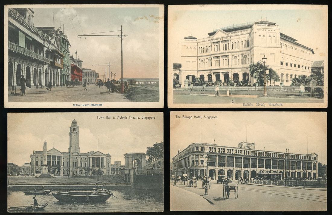 1920s nine Singapore scenery postcards, including High Street, Hindu Temple, Raffes Hotel and Collyer Quay, etc.