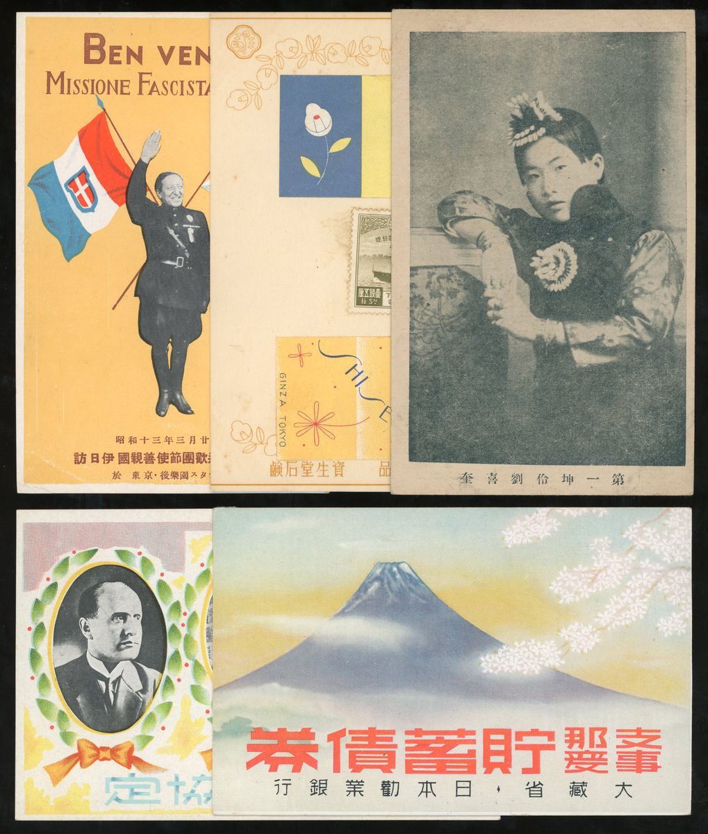日本早期圖畫明信片一組6件,包括資生堂廣告片3件,第一坤伶劉喜奎戲裝像1件,日本訪意大親善使團2枚(帶原封套),支那事變儲金債券宣傳片,部分貼偽滿票,銷紀念戳,整體保存完好