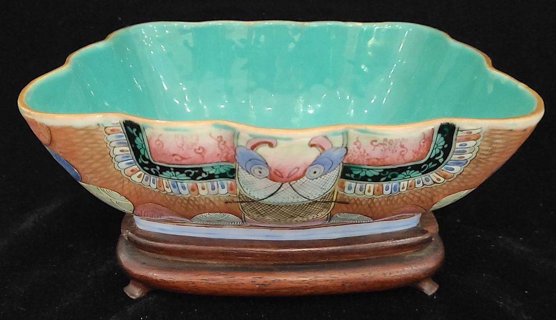 1862-1874 Butterfly-shaped bowl with butterfly pattern from the Tongzhi period of the Qing Dynasty, Internally coated with turquoise green glaze. With wooden base. Base model "Made in the Tongzhi Year of the Qing Dynasty", porcelain bowl size: about 11.5x16x5.8cm