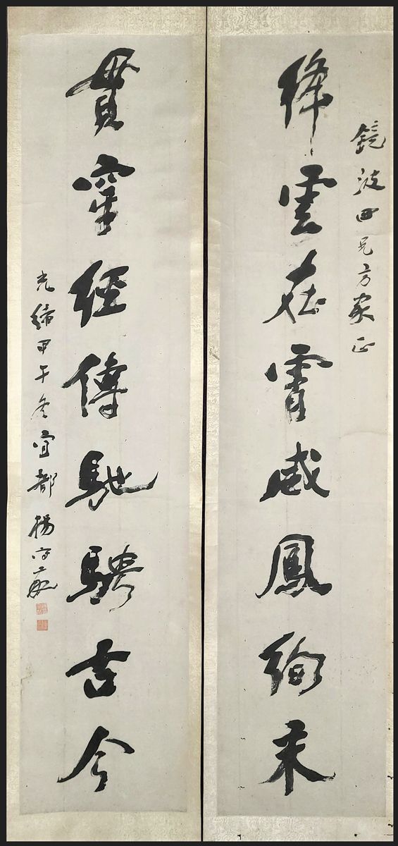 1894年 (光緒二十年甲午) 楊守敬行書對聯, 紙本立軸, 鈐印两枚. 尺寸: 38x173cmx2