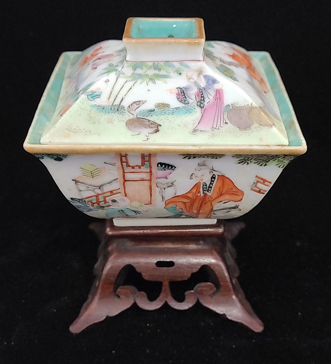 1900-1910年清末民初彩繪人物方型瓷盅 (帶蓋), 連木底坐. 瓷盅尺寸: 寬8.8x8.8cm, 高7.5cm