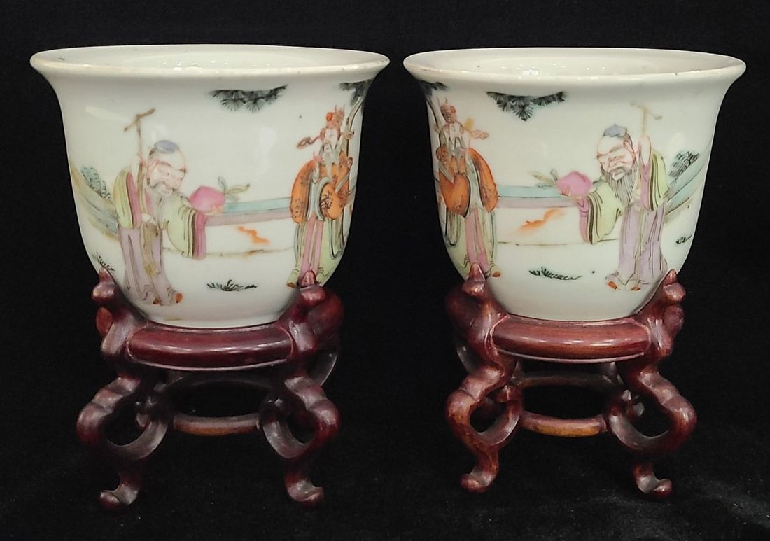 1910s-1920s A pair of small Chinese hand-painted character porcelain flowerpots with wooden bases. Flowerpot size: 11cm in diameter, 9.9cm in height.