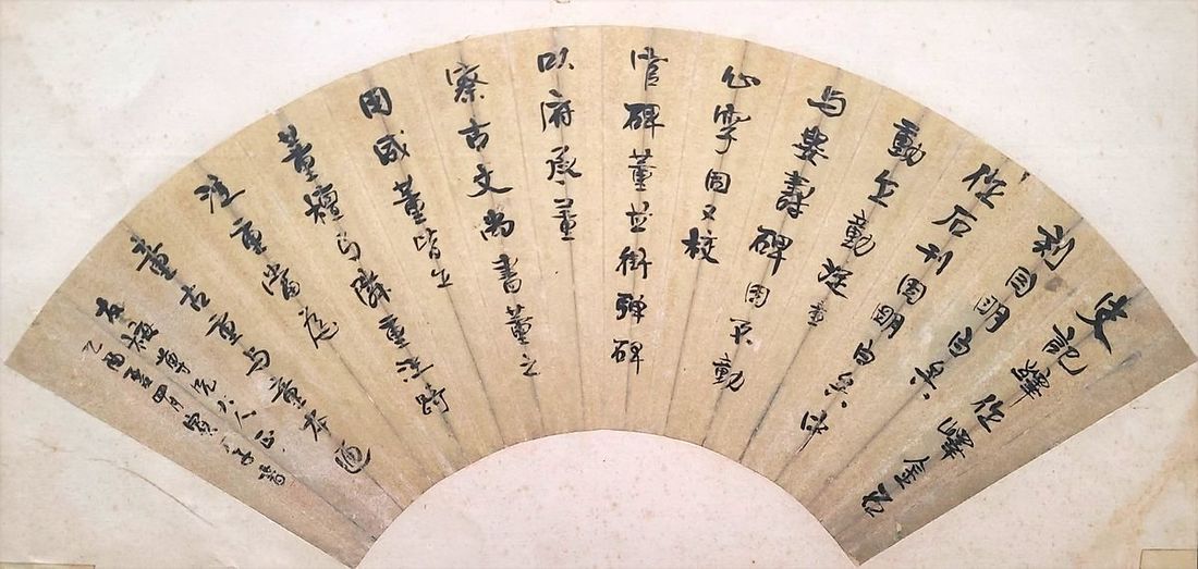 1945 Binchangzi running script on fan, ink on paper, with one seal. Size: 24x52.8cm