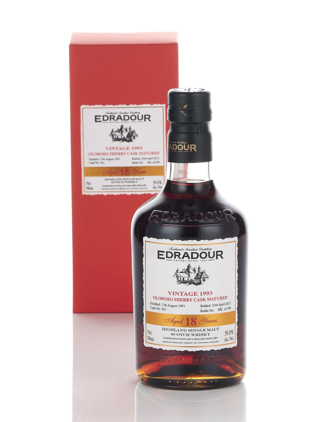 Bottle number 106 of 599. Cask no. 301, Oloroso Sherry. In original carton. Good label. Level: into neck. 700ml. Single Malt., 59% volume.