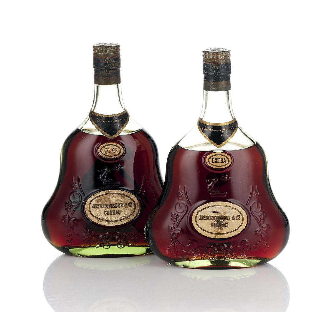 1x X.O., 1 x Extra. Stained main & back labels, corrode capsules. Level: 1x5cm, 1x6cm below foil. approx. 70cl. Cognac., abv not stated.