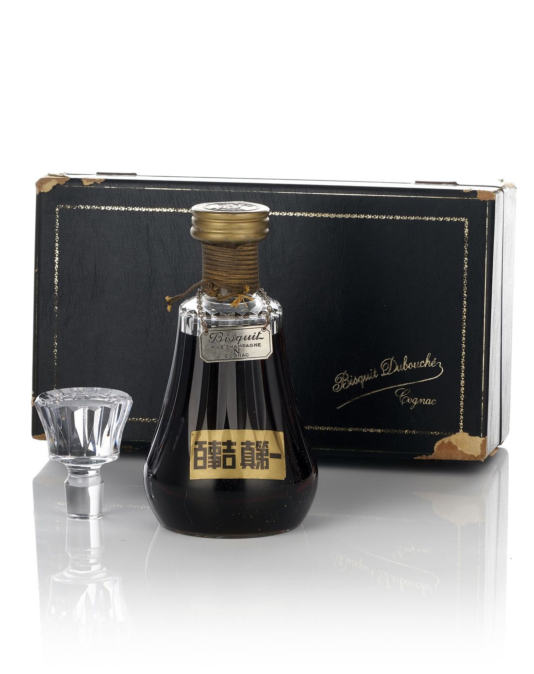 In baccarat decanter and stopper. In mold stained presentation carton. Good label. Level: 3cm. approx 70cl. Cognac., abv not stated.
