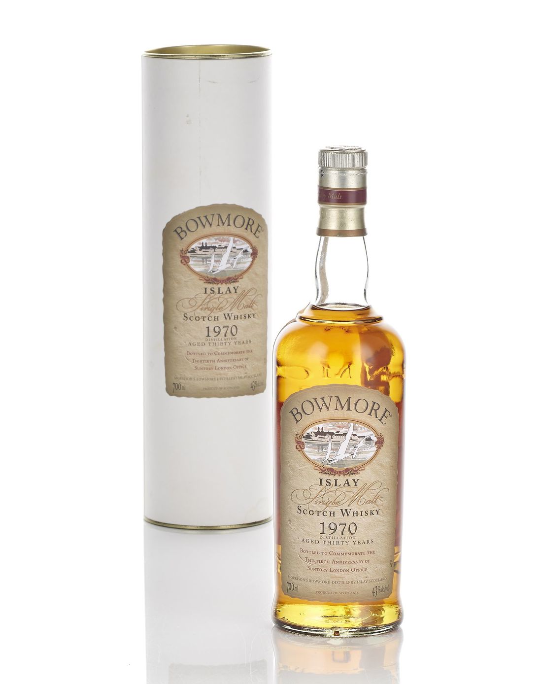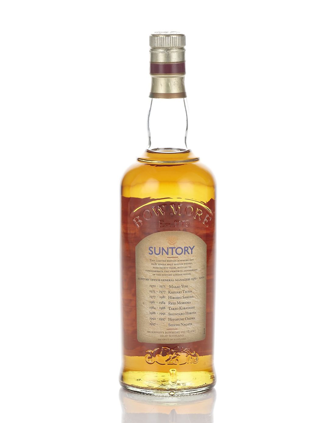 Bottled 2000 to Commemorate The Thirtieth Anniversary of Suntory London Office. Distilled and Bottled at Bowmore Distillery, Islay