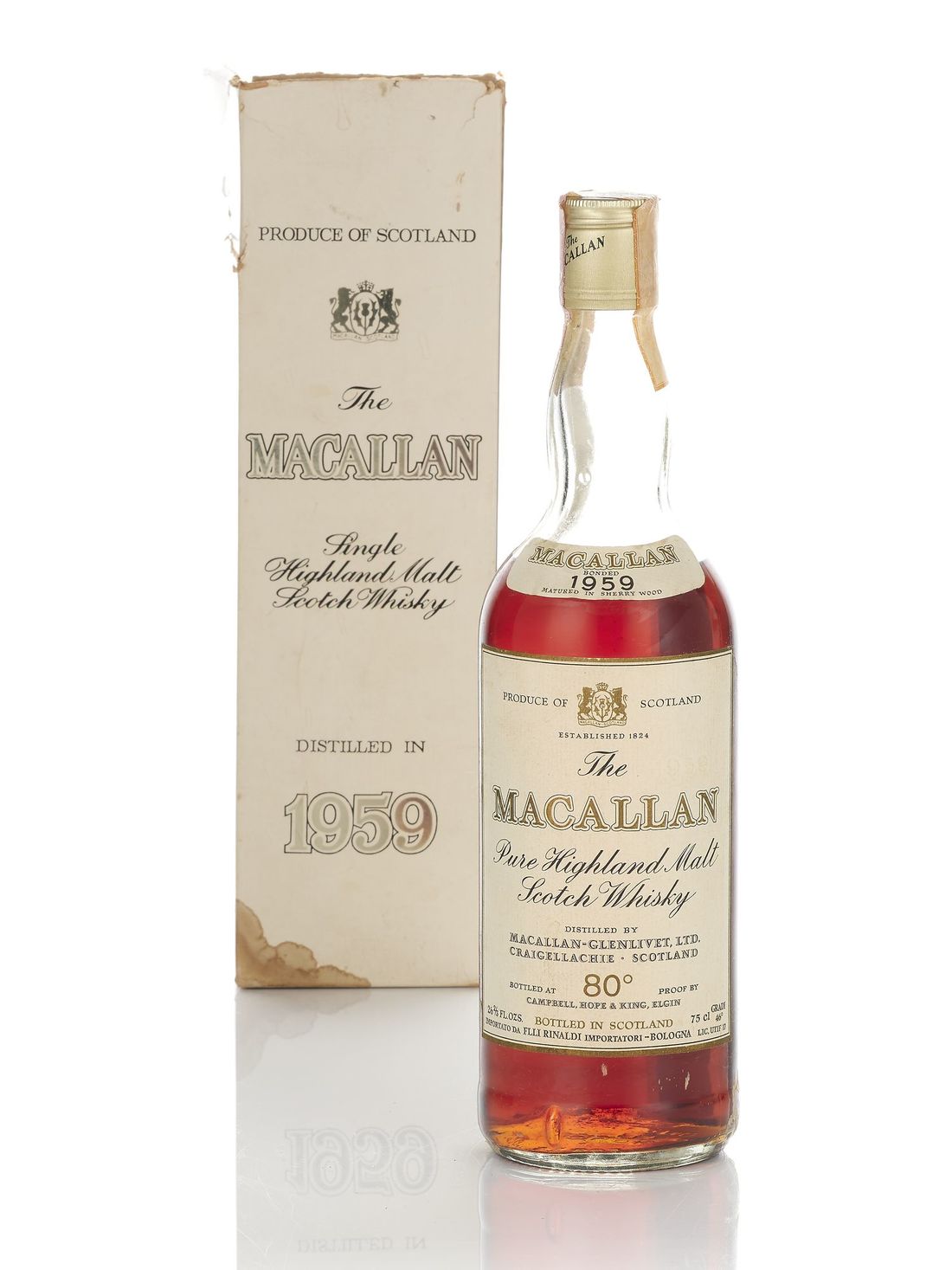 Bottled in 1970's. Imported by Rinaldi, Bologna. Distilled by Macallan-Glenlivet Ltd., Craigellachie. Bottled by Campbell, Hope and King Ltd., Elgin