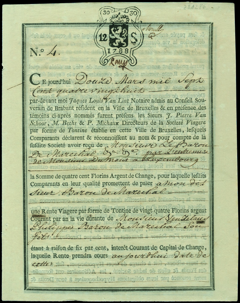 Tontines. Société Viagere par forme de Tontine. 6% Rente Viagère Tontine, 400 Guilders, 12. March 1788. Nr. 4. EF. In the 18th and 19th century, tontines were commonly used investment plans for raising capital. They combined features of a group annuity and a lottery. Each subscriber paid an agreed sum into the fund, and thereafter received an annuity. As members died, their share in the tontine was distributed to the other participants, resulting in an increase in the value of each of the remaining members’ annuity. Upon the death of the last member, the scheme dissolved. Tontines are named after the Neapolitan banker Lorenzo de Tonti, who is credited with inventing them in France in 1653. However, his proposal was rejected by parliament in Paris. The first true tontine was therefore issued in the Netherlands in 1670. Tontines soon became a common financial tool for the Kings of France and England to fund military operations: Louis XIV first made use of tontines in 1689 and the British government first issued tontines in 1693 to fund a war against France during the Nine Years’ War.