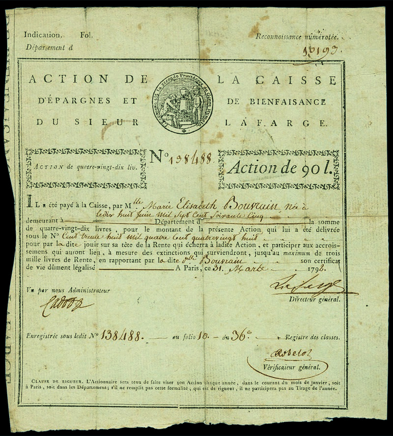 La Caisse d’Epargnes et de Bienfaisance du Seiur Lafarge. Share 90 Livres. Paris, 31. March 1792. Nr. 198488. The Caisse d’épargnes et de bienfaisance du Sieur Lafarge was by far the biggest tontine at the end of the 18th century. It represented an enormous innovation for the French financial system during the revolution. Mr. Lafarge (1748-1830) was of modest background. However he was a man who permanently was full of ideas and plans. In 1787 and again two years later, he submitted a plan of a “private tontine” to the King Louis XVI. Both times it was refused. In November 1790, as the French Revolution had started, Lafarge presented a new project to the Assemblée Constituante. He proposed a Company which organizes a tontine viagère. The tontine’s capital then was placed in state bonds. The representative Comte de Mirabeau was supportive of the proposal; however after a negative response from Maximilien de Robespierre, the project was rejected on the 5th March 1791. But Lafarge did not give up; he immediately drew up an adapted project, based on comments by the famous “Académie des science et des comités”. Only 21 days after the Caisse d’épargnes et de bienfaisance was finally accepted. The subscription of shares of the Caisse at Franc 90 each was open until 31st March 1792. It was a great success; in September 1793 the Company had collected more than 50 Million Francs and had nearly 120’000 shareholders. The Company went through difficult times. In the year of the revolution VI the Caisse lost nearly two third of its assets when the government debt was consolidated. However it continued to pay out to its shareholders. In 1808 the Commune de Paris took over the administration of the Caisse. In 1884 the yearly payment was an impressive 6’000 Francs per share. In 1888, the last shareholder died and the tontine was finally dissolved. The share is comparatively in a very good condition. Emblem of the Company with the inscription “J’appellerais volontiers l’économie la seconde providence du genre humain”, a quote from comte de Mirabeau. With the signature of Lafarge as Directeur général. VF. In the 18th and 19th century, tontines were commonly used investment plans for raising capital. They combined features of a group annuity and a lottery. Each subscriber paid an agreed sum into the fund, and thereafter received an annuity. As members died, their share in the tontine was distributed to the other participants, resulting in an increase in the value of each of the remaining members’ annuity. Upon the death of the last member, the scheme dissolved. Tontines are named after the Neapolitan banker Lorenzo de Tonti, who is credited with inventing them in France in 1653. However, his proposal was rejected by parliament in Paris. The first true tontine was therefore issued in the Netherlands in 1670. Tontines soon became a common financial tool for the Kings of France and England to fund military operations: Louis XIV first made use of tontines in 1689 and the British government first issued tontines in 1693 to fund a war against France during the Nine Years’ War.