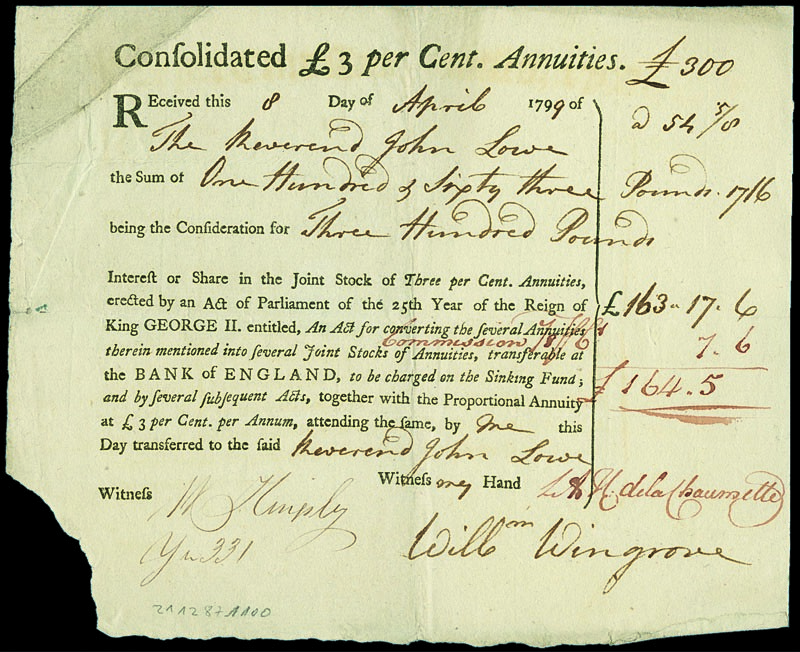König George II. 3% Consolidated Annuities über £300. 8. April 1799. Druck auf Büttenpapier. Starke Gebrauchsspuren. Fehlstelle an der linken Ecke. VF.