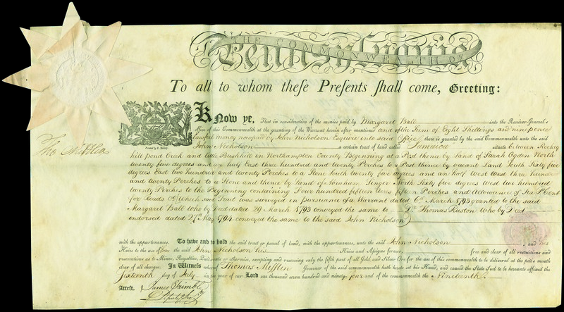 Commonwealth of Pennsylvania 1794. Schuldverschreibung für John Nicholson, der als Geschäftspartner von Robert Morris 1895 die North American Land Co mitbegründete. Handschriftlich ausgestellt auf Pergament mit Originalsiegel. John Nicholson (-1800) war urprünglich ein Beamter aus Pennsylvania. Mit dubiosen Geschäftsmethoden machte er eines der grössen Vermögen des Landes. 1794 musste er von seinen Funktionen zurücktreten. Er wurde zum Geschäftspartner von Robert Morris in verschiedensten Landspekulationen. Diese bedeuteten für beide jedoch bald den Bankrott. Nicholson kam 1800 in Gefängnis, wo er einige Monate später verstarb. VF.