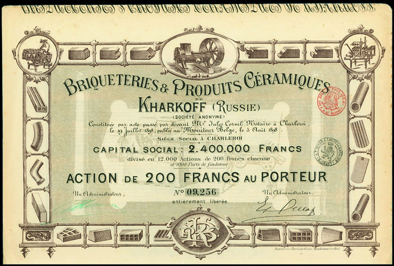 Briqueteries & Produits Céramiques de Kharkoff. Action F 200, Paris, 5. August 1898. Nr. 9256. Leicht stockfleckig. VF.