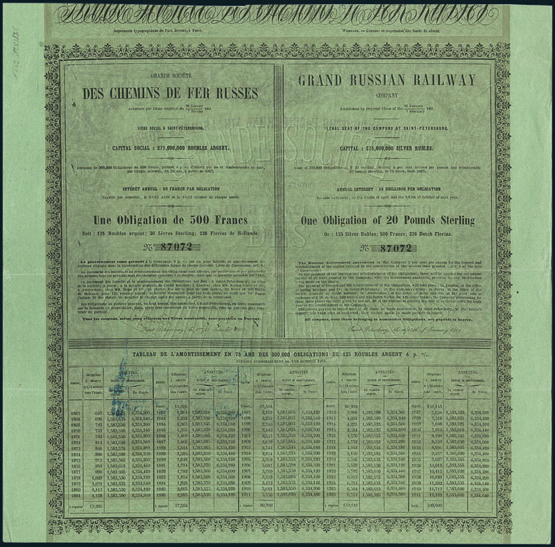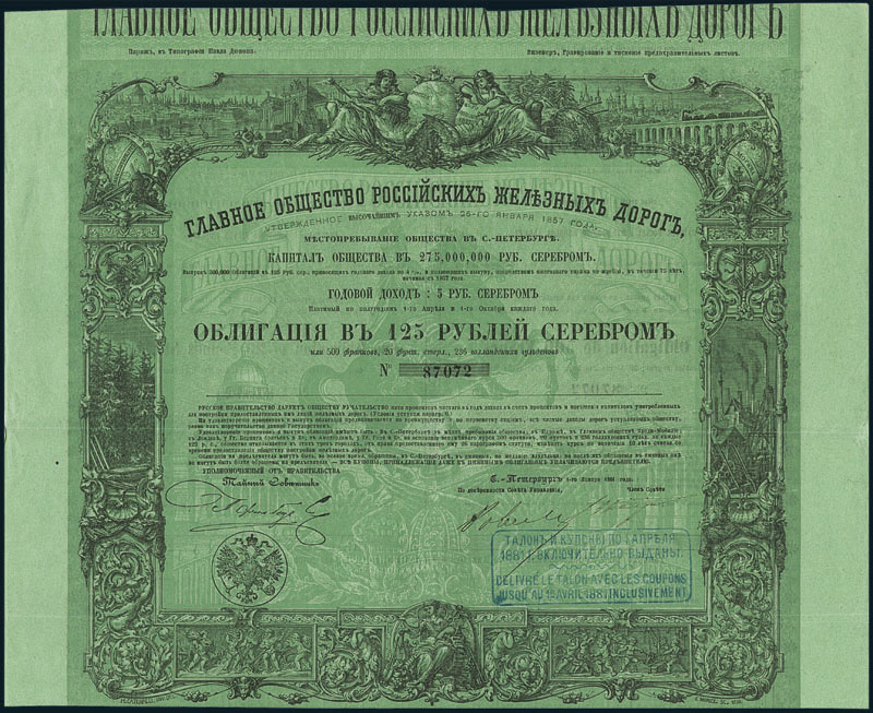 Grand Russian Railway. Obligation über 20 Pfund Sterling oder 125 Silberrubel oder 500 Francs oder 236 deutsche Gulden. St. Petersburg, 13. Januar 1861. Grün. Nr. 87072. Die Gesellschaft wurde von der Pariser Bank Crédit Mobilier gegründet. Sie sollte die Strecken St. Petersburg - Warschau, Moskau - Nishni-Nowgorod, Moskau - Feodosia und Orel-Libau errichten. Die Gesamtlänge lag bei mehr als 4.300 km. Die ersten beiden Strecken waren 1863 fertig. Im Jahr 1868 wurde dann von der Grossen Russischen Eisenbahn auch der Betrieb auf der Nicolaibahn übernommen. EF.