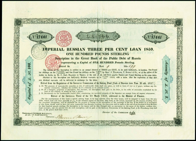 Imperial Russian Loan 1859. 3% Bond £100, London 20. March 1859. Nr. 17461. Eine Faltung in der Mitte und links einige Nadellöcher. EF.
