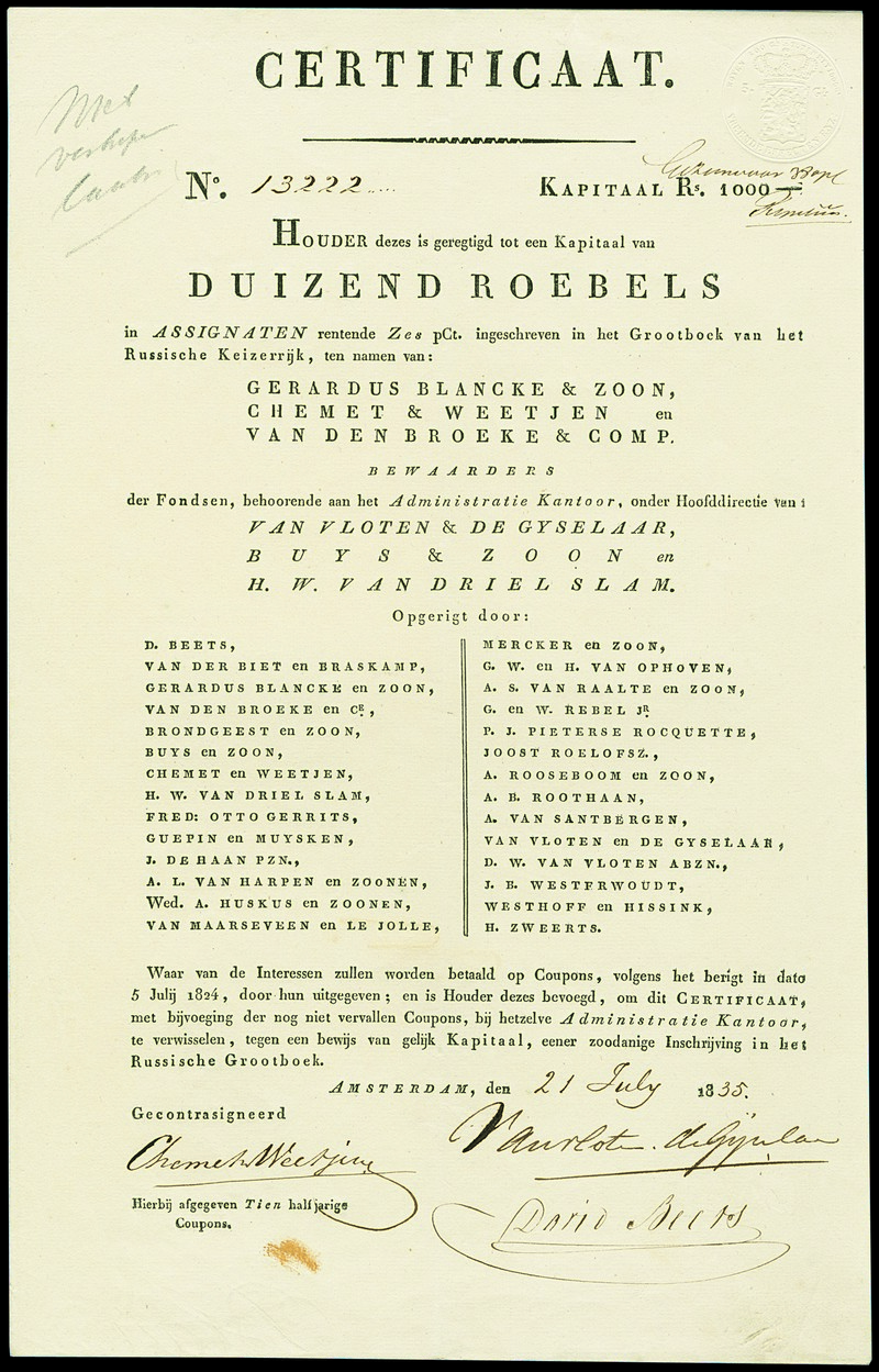 Russisches Keizerrijk. Certificaat über 1.000 Rubel. Amsterdam, 21. Juli 1835. Nr. 13222. Für das Alter in Top-Erhaltung. EF.