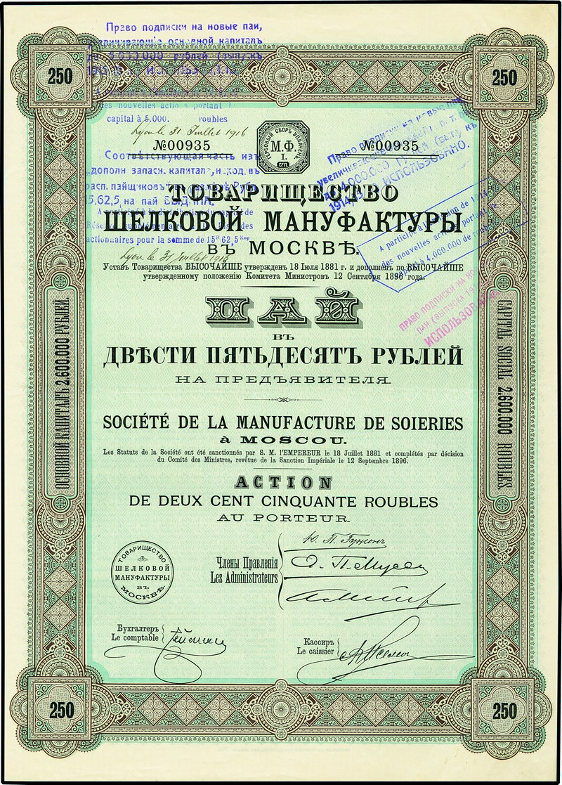 Société de la Manufacture de Soieries à Moscou. 1. Emission. Gründerstück Nr. 935. EF. Aktien über 250 Rubel, 1896. Diese 1881 gegründete Textilgesellschaft produzierte Seidenstoffe. Die Triplette der Aktien (1. bis 3. Emission) dieser Gesellschaft wurde bislang noch nie angeboten.