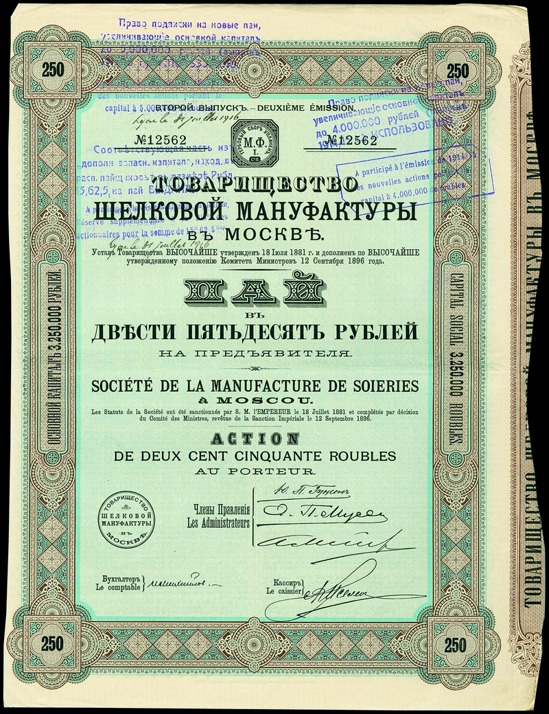 Société de la Manufacture de Soieries Moscou. 2. Emission Nr. 12562. VF. Aktien über 250 Rubel, 1896. Diese 1881 gegründete Textilgesellschaft produzierte Seidenstoffe. Die Triplette der Aktien (1. bis 3. Emission) dieser Gesellschaft wurde bislang noch nie angeboten.