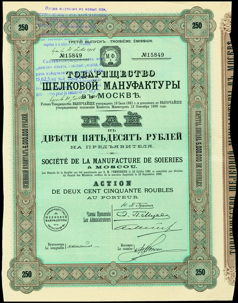 Société de la Manufacture de Soieries à Moscou. 3. Emission Nr. 15849. EF. Aktien über 250 Rubel, 1896. Diese 1881 gegründete Textilgesellschaft produzierte Seidenstoffe. Die Triplette der Aktien (1. bis 3. Emission) dieser Gesellschaft wurde bislang noch nie angeboten.