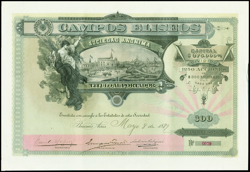 Campos Eliseos SA. Aktie über 300 Pesos. Buenos Aires, 8. Mai 1889. Beige/Rosa. Nr. 0079. Die Gesellschaft wurde für den Bau eines Erholungs- und Vergnügungsparkes in Buenos Aires gegründet. EF.