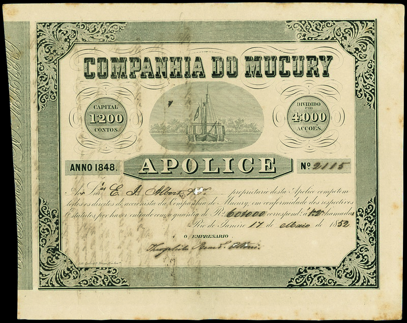 Companhia do Mucury. Aktie. Rio de Janeiro, 17. Mai 1852. Nr. 2115. This share is signed by Teofilo Beneditto Ottoni (1807-1869), from Italian descent, Brazilian journalist, merchant, politician and businessman was one of the main leaders of the Brazilian Liberal Revolution in 1842 in Minas Gerais and later leader of the Brazilian Liberal Party. 1850 he founded the “Companhia do Mucury”, which aimed to promote the development and colonization of the Valley River Mucuri by European immigrants, especially Germans. He founded a town in Minas Gerais, that today bears his name. Small holes due to ink corrosion. EF.