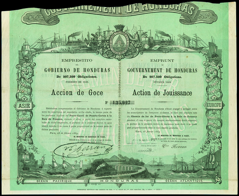 Gouvernement de Honduras. Action de Jouissance. Paris, 28. Februar 1869. Blaugrün. Nr. 135927. This "action de Jouissance" was attached to a bond issued at the same time. The owner had the right of a 1/3 of the net-income of the railway from Porto Cortez to the Bay of Fonseca. What followed was a big financial scandal in London and Paris.The railway was never built and Honduras was left with a big dept. VF.