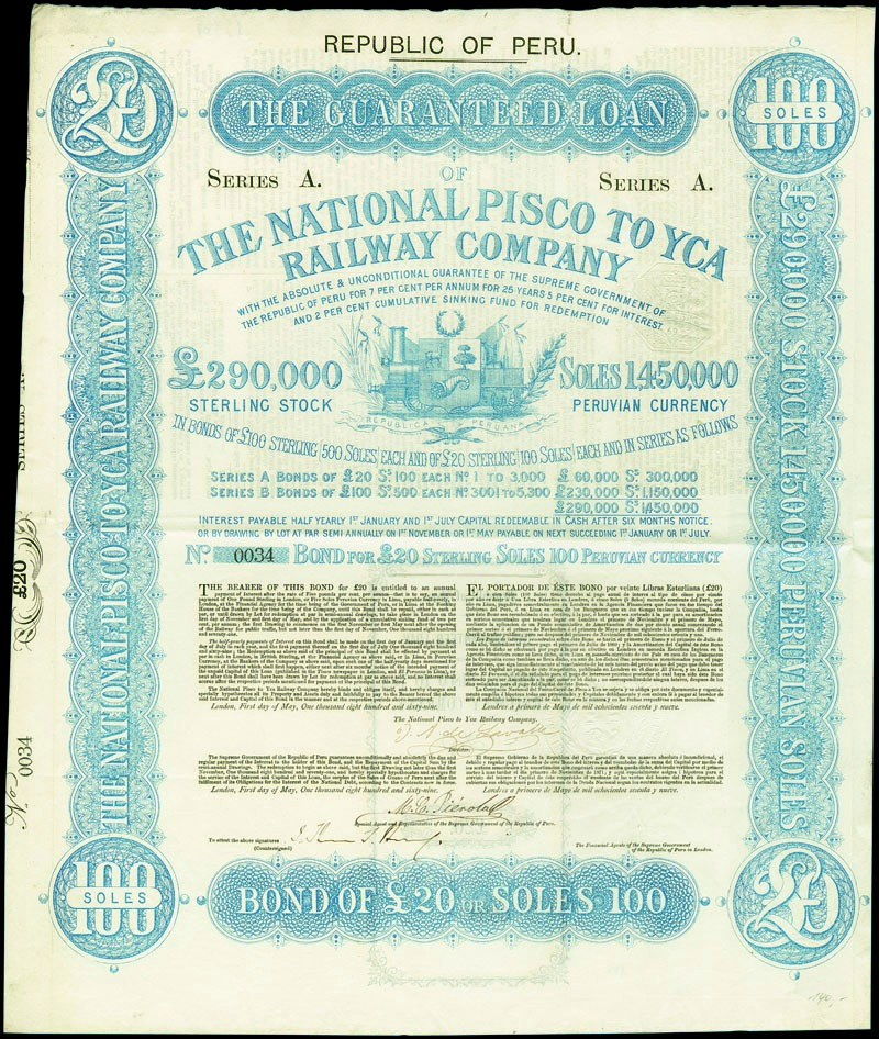 Republic of Peru: The National Pisco to Yca Railway Company. Guaranteed Loan. London, 1. May, 1869, No. 2417, for 20 Pounds Sterling or 100 Soles Peruvian Currency. Issued and uncancelled, certificate is in very good condition, with fold marks, slight egewear, and 37 coupons attached. Text is in English and Spanish. Nr. 34. Die Gesellschaft betrieb eine Eisenbahn von den Bergwerksregionen zur Pazifikküste. Eine der ältesten südamerikanischen Eisenbahn-Anleihen! VF.