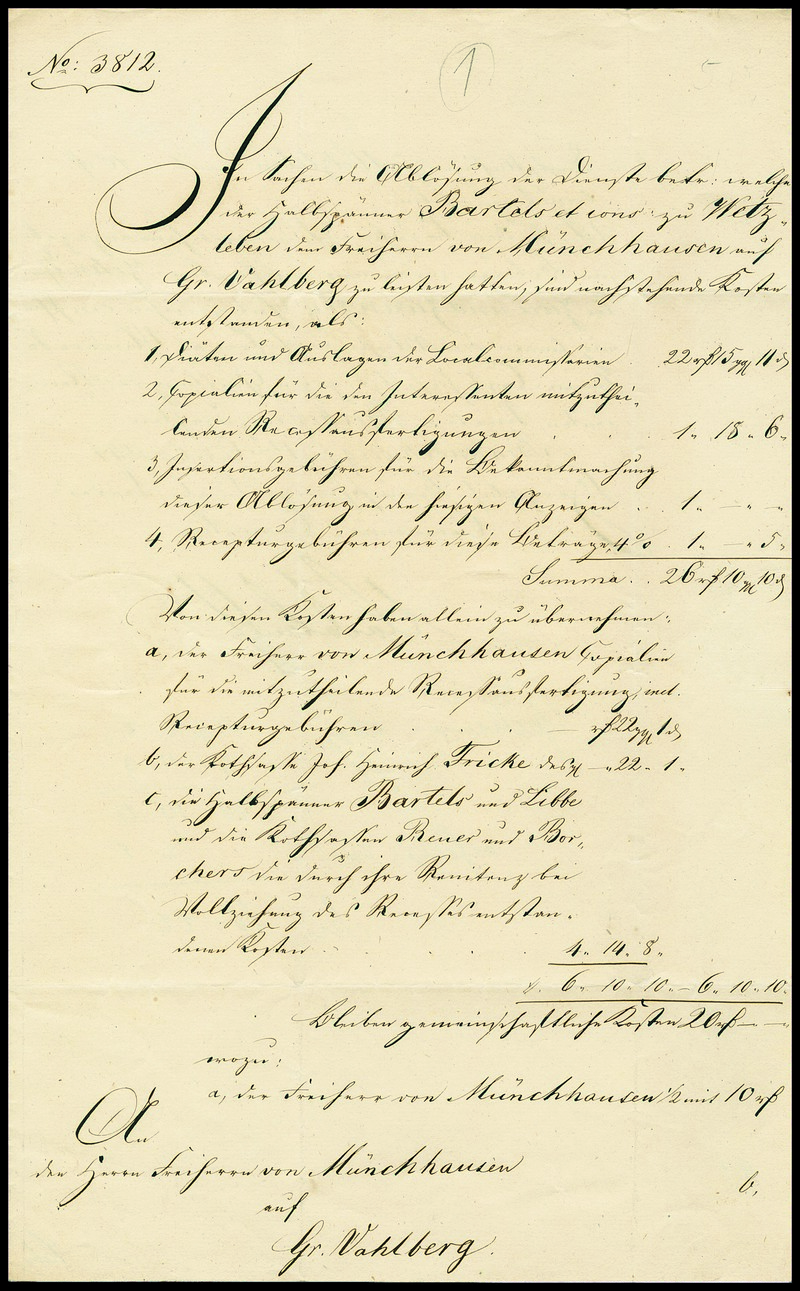 Freiherrn von Münchhausen. Rechnung in Briefform, Braunschweig am 1. Oktober 1841. Alexander Freiherr von Münchhausen (1813-1886) war ein hannoverscher Staatsmann aus dem niedersächsischen Adelsgeschlecht derer von Münchhausen. Von 1850 bis 1851 war er Ministerpräsident des Königreichs Hannover. VF.