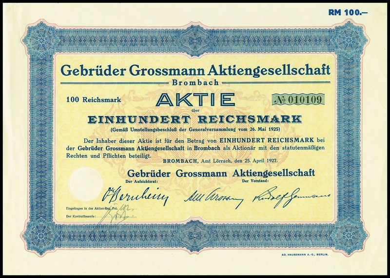 Gebr. Grossmann AG Brombach. Aktie über 100 Reichsmark. Brombach, Amt Lörrach, 25. April 1927. Blau/gelbbraun. Nr. 10109. Die 1837 gegründete Weberei der Gebrüder Grossmann aus Aarburg (Schweiz) bestimmte das wirtschaftliche Leben des Ortes Brombach für viele Jahrzehnte massgeblich. Spätere Gründungen waren textile Ausrüstungsbetriebe, die Druckerei und Appretur Brombach (1899) und die Firma Ausrüstung an der Wiese (1925). Grosse Bedeutung für die Entwicklung des Ortes hatte auch hier der von den Gebrüdern Grossmann betriebene Arbeiterwohnungsbau. 1931 erfolgte die Liquidation. Am 1. Januar 1975 kam Brombach als Ortsteil zu Lörrach. Unentwerteter Titel mit Couponbogen. EF.